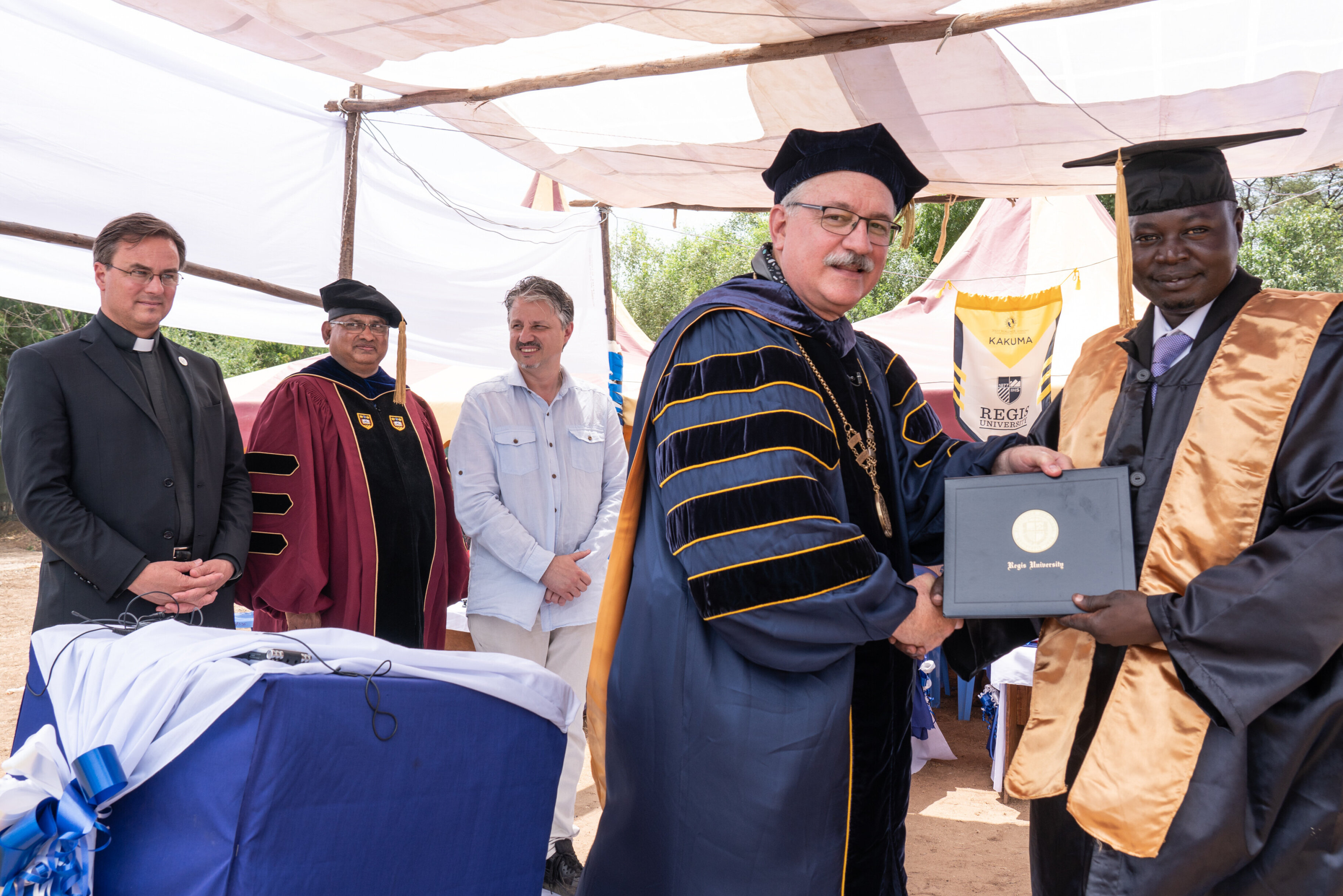 In July 2018, Father John Fitzgibbons, S.J. and Father Daniel Hendrickson, S.J., Presidents of Regis and Creighton Universities, respectively, hosted the Graduation Ceremonies at Kakuma Refugee Camp, Kenya and Dzaleka Refugee Camp, Malawi. Fifty students received Diplomas in Liberal Studies during the ceremonies. This article includes a brief description of Jesuit Worldwide Learning precedes Father Fitzgibbons’ speech to the graduates.