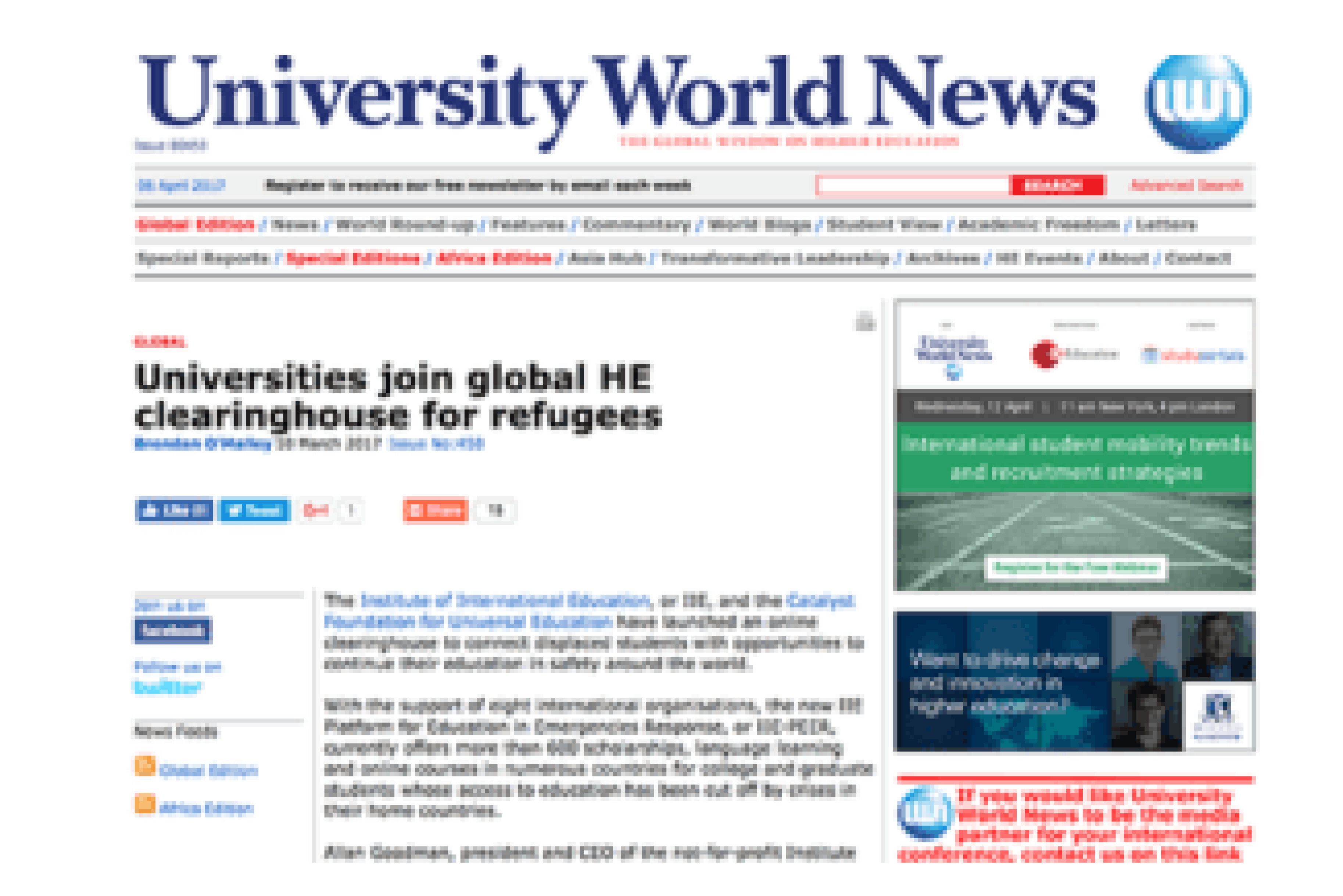 The Institute of International Education, or IIE, and the Catalyst Foundation for Universal Education have launched an online clearinghouse to connect displaced students with opportunities to continue their education in safety around the world.