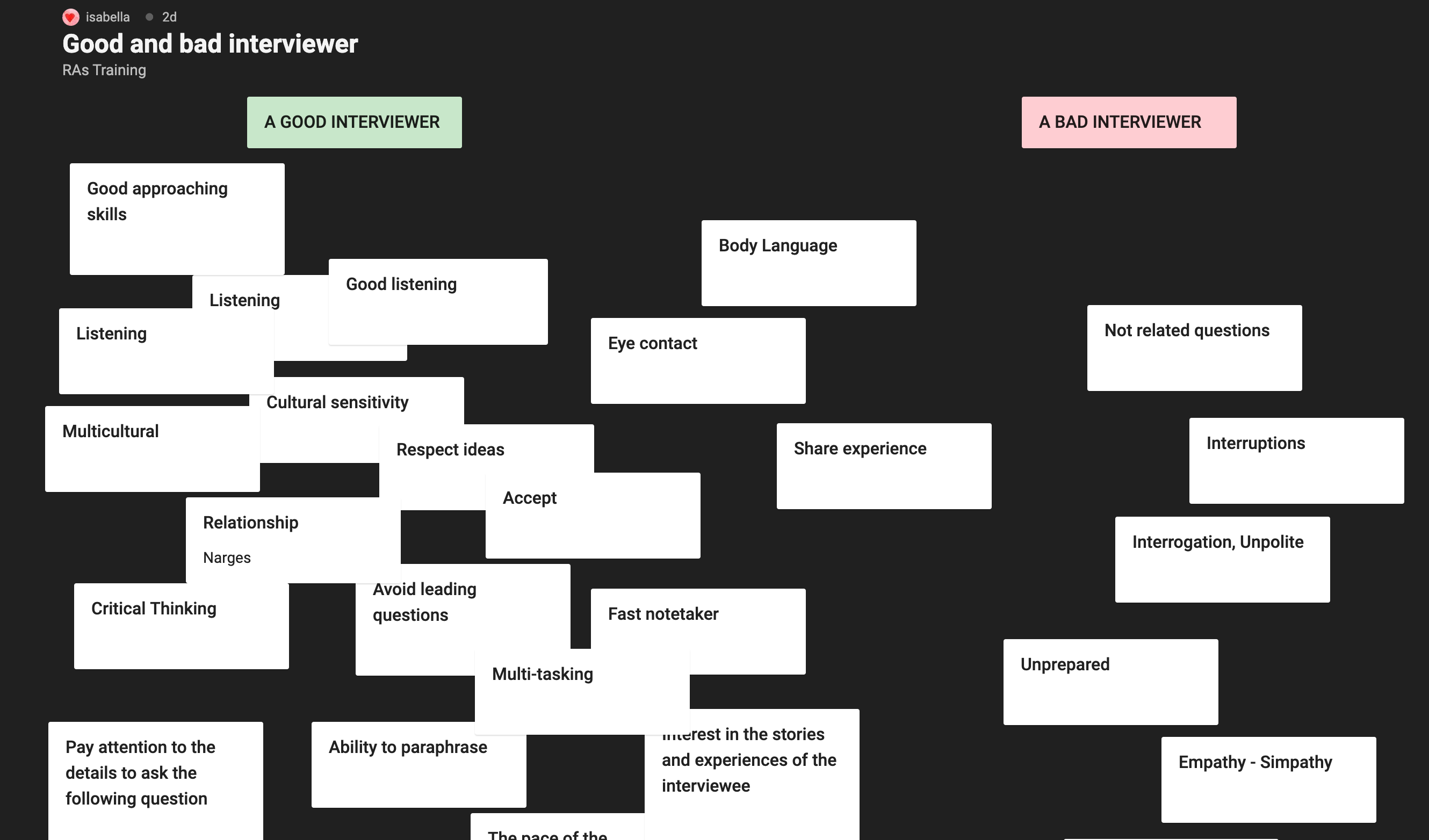 The training was structured in two sessions. During the first session, we discussed the objectives of the research project and delved deep into qualitative interviewing. Two key moments of the training were the ice-breaking exercise, in which we reflected on what makes a good or bad interviewer, and the session held by Prof. Barbara Schellhammer (Munich School of Philosophy) that allowed the participants to reflect on their own cultural and personal bias. We also used break-out rooms to make the participants practise as interviewer and interviewee.